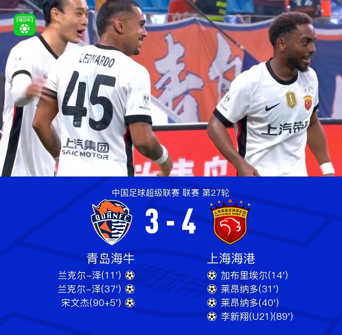 中超|青岛海牛3-4惜败上海海港,兰克尔-泽双响难救主